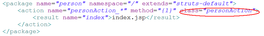 1 <?xml version="1.0" encoding="UTF-8" ?> 2 <!DOCTYPE struts PUBLIC 3 "-//Apache Software Foundation//DTD Struts Configuration 2.0//EN" 4 "http://struts.apache.org/dtds/struts-2.0.dtd"> 5 6 <struts> 7 <package name="person" namespace="/" extends="struts-default"> 8 <action name="personAction_*" method="{1}" class="personAction"> 9 <result name="index">index.jsp</result> 10 </action> 11 </package> 12 </struts>