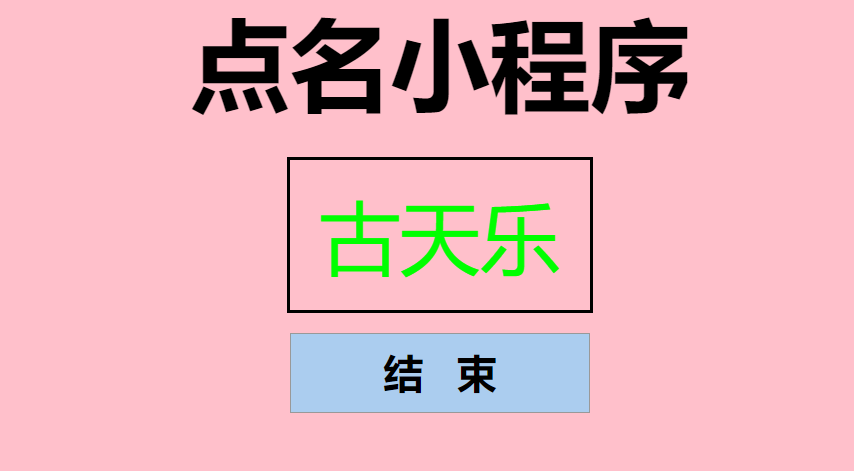 <!doctype html> <html> <head> <meta charset="utf-8"> <title>Document</title> </head> <style> *{ padding: 0; margin: 0; list-style: none; background: pink; outline:none; } #personName{ width: 300px; height: 150px; border:solid #000; margin:30px 0 20px; font-size:80px; line-height:150px; color:#0f0; } #btn{ width: 300px; height: 80px; font-size:40px; line-height: 80px; font-weight:bold; border:0; border:1px solid #999; background-color: #abcdef; } h1{ font-size:100px; } </style> <body> <center> <h1>点名小程序</h1> <div id="personName">周杰伦</div> <button id="btn">开 始</button> </center> </body> <script type="text/javascript"> var arr = ['胡歌','古天乐','刘亦菲','张国荣','梁家辉','王金宝','李连杰','成龙']; var timer; btn.onclick = function(){ if(this.innerHTML == "开 始"){ this.innerHTML = "结 束" timer = setInterval(function(){ var index = parseInt(Math.random()*8); personName.innerText = arr[index]; },50); }else{ this.innerHTML = "开 始" clearInterval(timer); } } console.log(parseInt(Math.random()*8)); </script> </html>