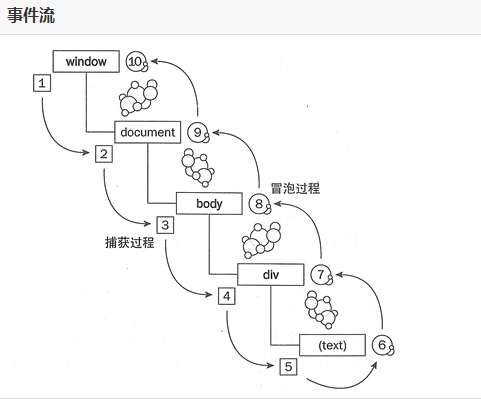 事件流的三个阶段:捕获阶段,目标阶段,冒泡阶段。