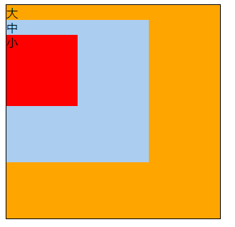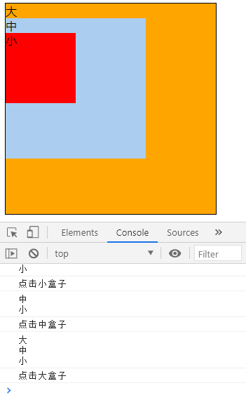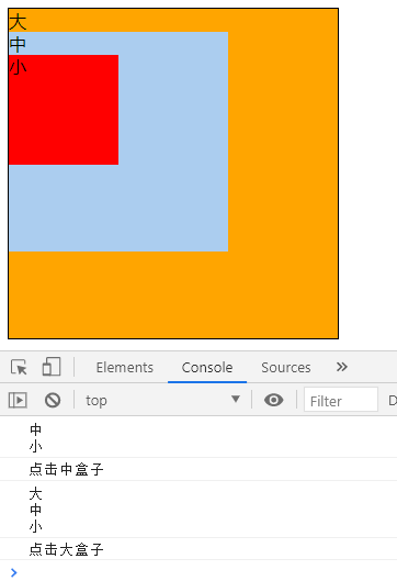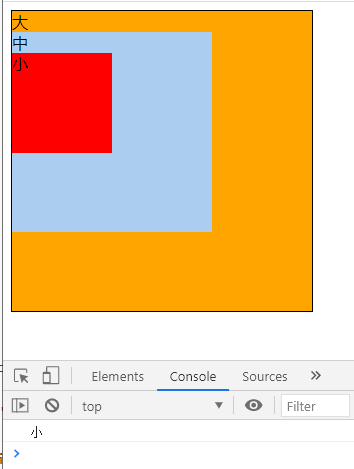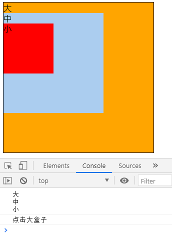 <style> #big{ width: 300px; height: 300px; border:1px solid #000; background:orange; } #middle{ width: 200px; height: 200px; background: #abcdef; } #small{ width: 100px; height: 100px; background: red; } </style> <body> <div id="big"> 大 <div id="middle"> 中 <div id="small"> 小 </div> </div> </div> </body> <script> big.onclick=function(){ console.log(this.innerText); console.log("点击大盒子"); } middle.onclick=function(){ console.log(this.innerText); console.log("点击中盒子"); } small.onclick=function(){ console.log(this.innerText); console.log("点击小盒子"); } </script>