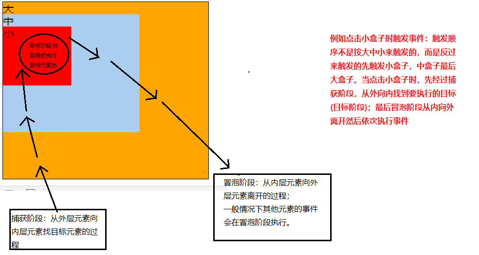 上面的情况说明:点击小盒子,发现小盒子事件完毕后,中盒子的事件也被触发了,接着大盒子的事件也被触发了。这就是说目标元素的事件在目标阶段执行,其他事件会在冒泡阶段执行。