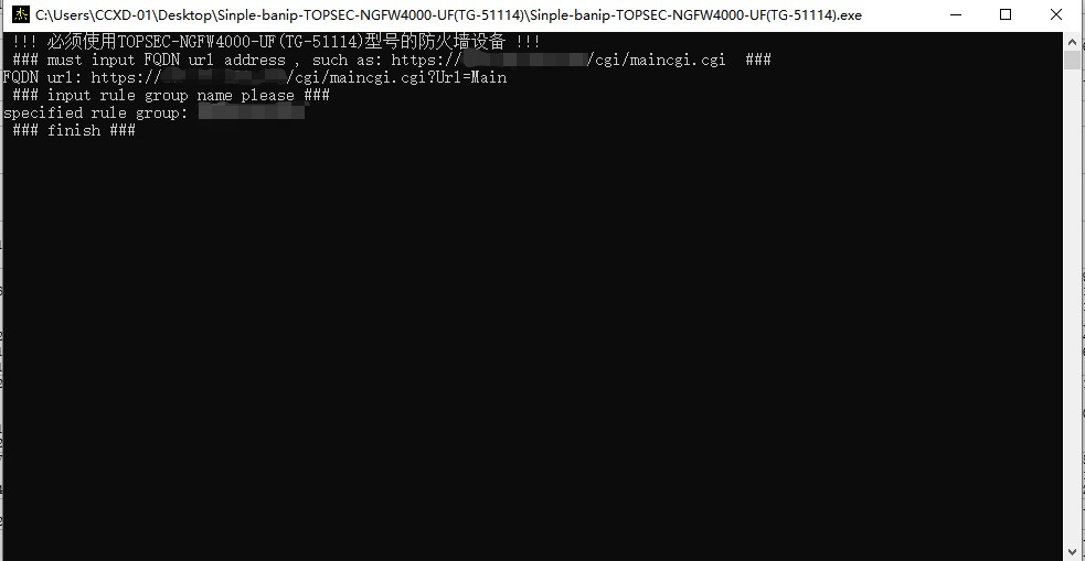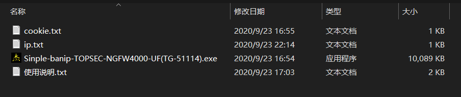 此工具包括主程序文件"Sinple-banip-TOPSEC-NGFW4000-UF(TG-51114)",以及“ip.txt”、“cookie.txt”两个配置文件。其中"ip.txt"负责存储封堵的IP地址,"cookie.txt"负责存储登陆过后下发的session串
