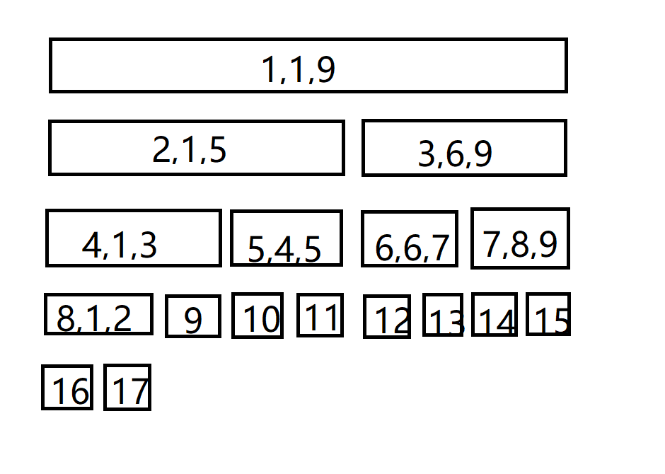 其中每个节点上写的三个数分别表示:节点编号,区间左端点,区间右端点 。有些节点只写了 节点编号 ,因为它们的 左端点 = 右端点,即元区间,写不下,见谅。