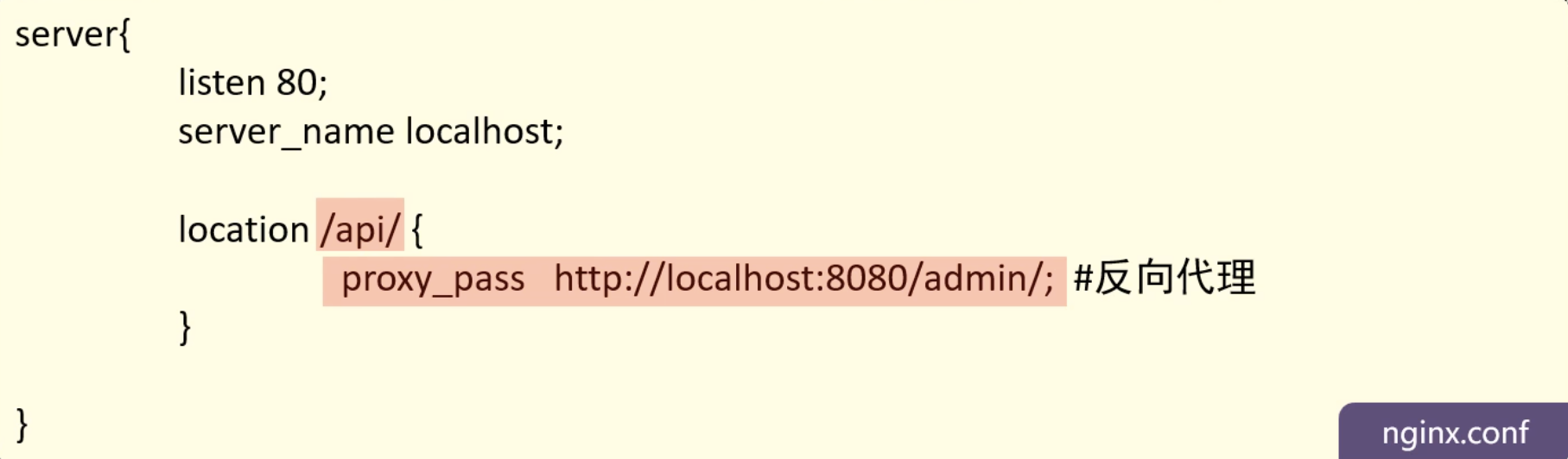 就是当前端发送请求到nginx服务器端时 nginx会监听请求 当请求是80且请求中带有/api时 就会反向代理 换成对应的地址 然后api后面的地址会动态拼到代理后的地址上