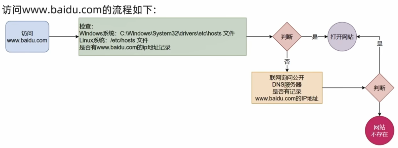 Windows在:C:\Windows\System32\dirvers\etc\hosts - 如果没有就去DNS服务器(如114.114.114.114,8.8.8.8)中询问