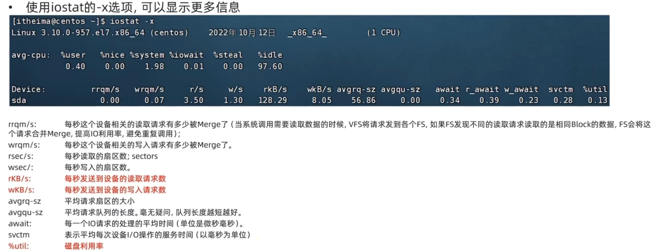 语法:iostat [-x][num1][num2]- x 显示更多信息