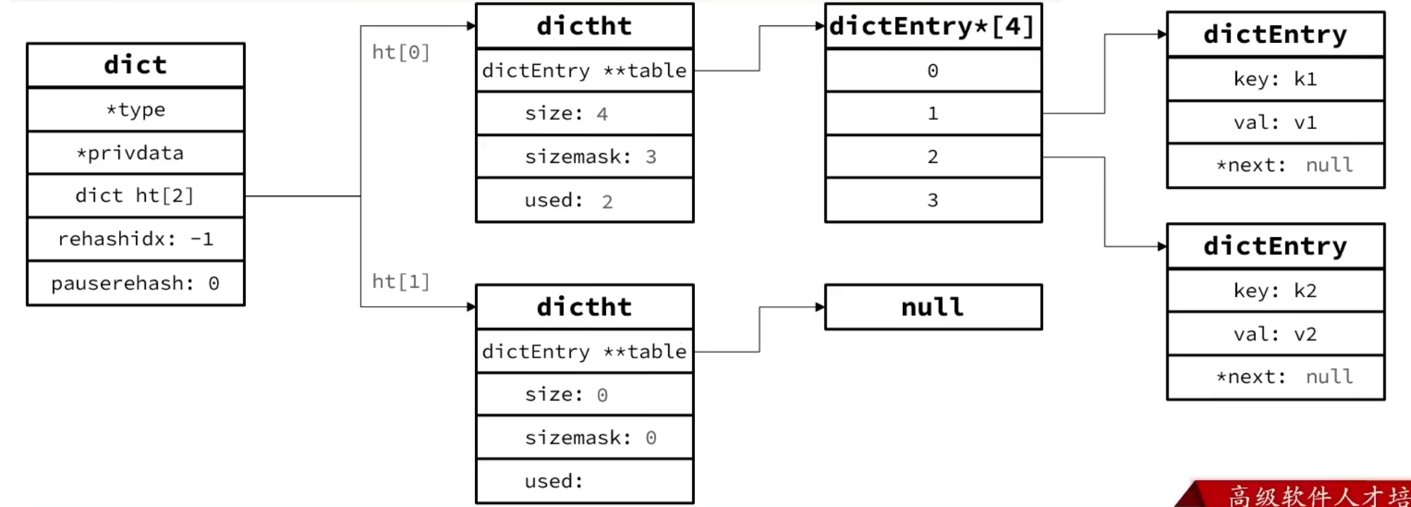 Dict由三部分组成 哈希表(DictHashTable) 哈希节点(DictEntry) 字典(Dict) Dict中前两个是为了哈希运算 后两个是为了rehash 只有ht[2]其中一个是保存数据 另一个也是rehash 编码如下