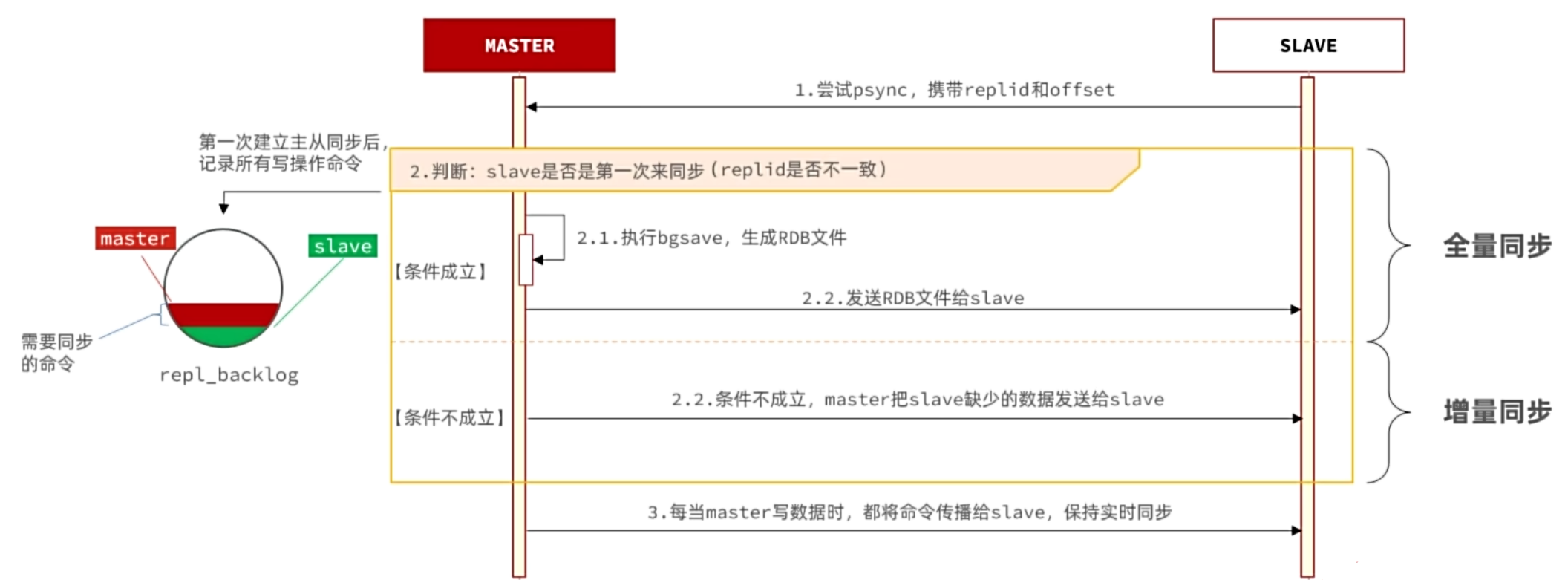 正常情况下 master写数据 slave同步数据 在缓冲区中是不会出问题的 只要二者差距小于一圈 都能追上 但是如果从节点宕机太久 导致主节点超过了从节点 把从节点的offset覆盖掉了 导致backlog中只有master的offset 这种情况下 从节点会直接做全量同步