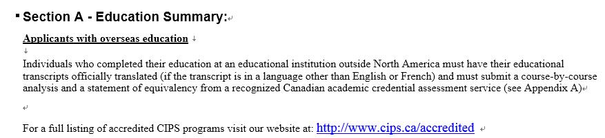 在北美以外教育机构完成教育的申请者需要翻译成绩单,同时还要提交一份课程评估以及加拿大认证的学术证书评估机构提供的声明。成绩单需由教育机构直接寄送到注册办公室,不承认私人教育机构的成绩单,除非这家机构是CIPS认证的。