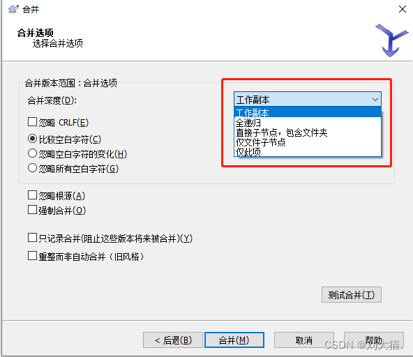 Working copy(工作副本):即你当前的工作目录,一般默认为这个选项;Recursively(递归):即你选择的目录的版本库,包括了其下面的子文件,子文件夹,包括子文件夹里面的内容;Direct children(直接子节点):即你选择的目录下面的文件,文件夹,但是不包括文件夹里面的子文件,子文件夹;Files in a folder(仅文件子节点):即你选择的目录下面的文件,但不包括文件夹,当然不包括的文件夹下面的所有内容也都不纳入合并范围;Only a folder(仅此项):没有任何合并内容。