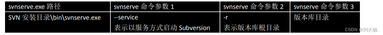 | svnserve | -d 表示后台执行 | -r 表示版本库根目录 | D:\DevRepository\Subversion |