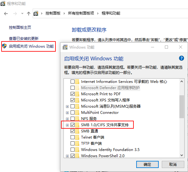 win10需要在控制面板,程序和功能,启用或关闭windows功能,中开启SMB 1.0/CIFS文件共享支持。