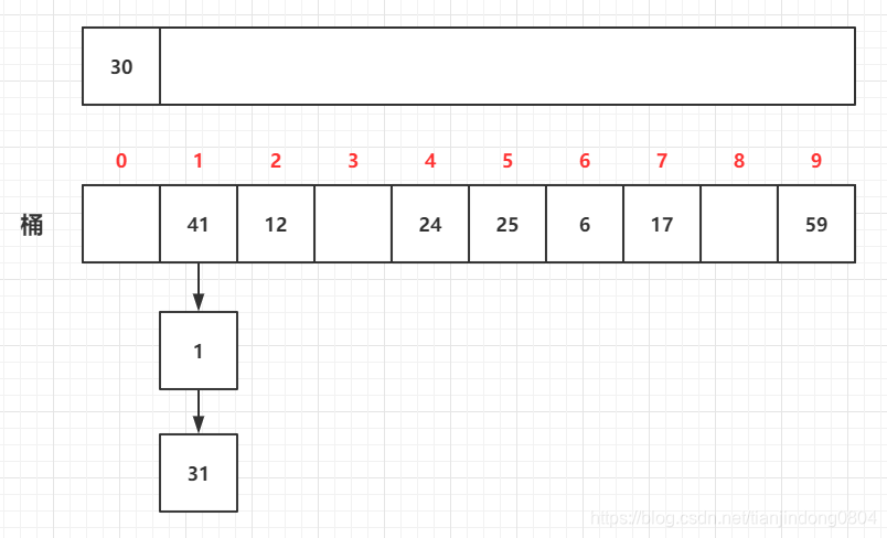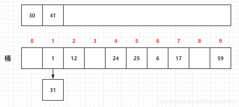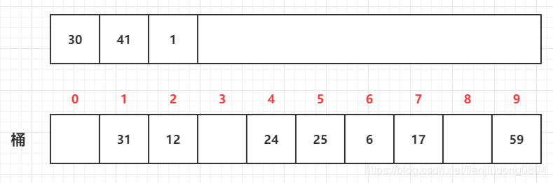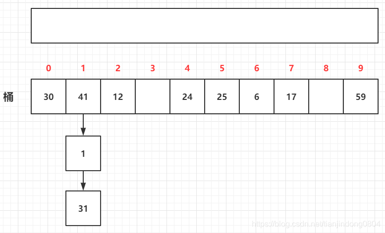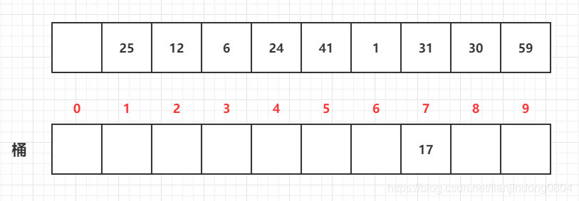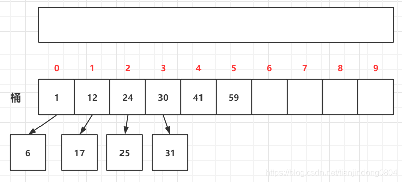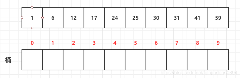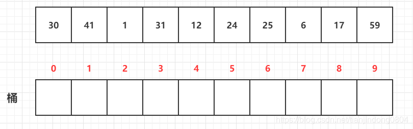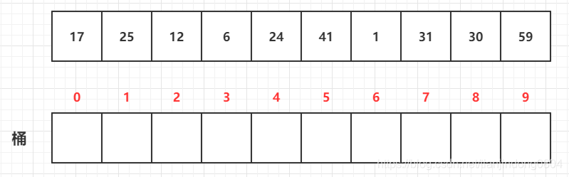 我们先给出一个待排序数组,和10个桶(桶从0开始编号):
