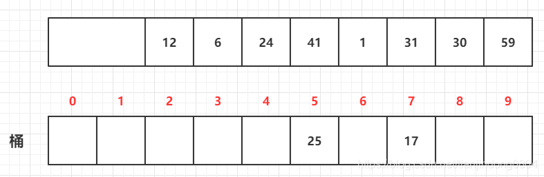 我们需要依次将数组中取出来,分别放入10个桶中,入桶的规则:在第一回合中将数组元素按照个位上的值与“桶”号对应,进行入桶操作,例如:12,22,32,42,52这些都入2号桶。