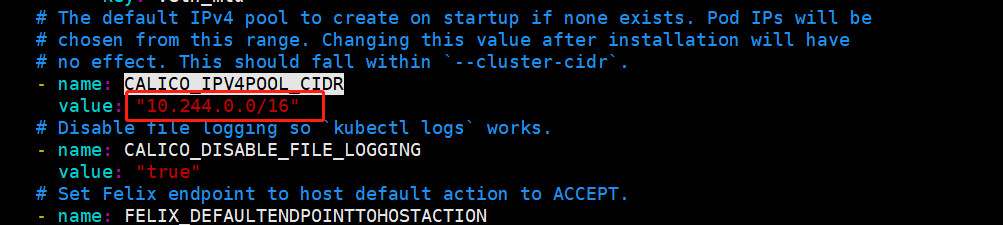 - 修改yaml文件,将CALICO_IPV4POOL_CIDR为10.244.0.0/16,与上述初始化的pod网络一致