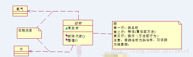 动物依赖水和氧气才能存在。它们是依赖关系,用虚线箭头表示。