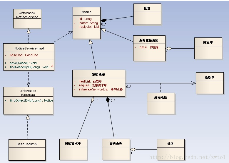 3. NoticeServiceImpl通过save方法的参数引用Notice,是依赖关系。同时调用了BaseDao完成功能,也是依赖关系。