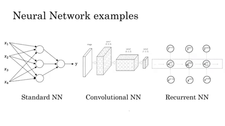 So language is also most naturally represented as sequence data.And so more complex versions of RNNs are often used for these applications.And then, for more complex applications, like autonomous driving,where you have an image, that might suggest more of a CNN convolution neural network structure and radar info which is something quite different. You might end up with a more custom, or some more complex,hybrid neural network architecture. So , just to be a bit more concrete about what are the standard CNN and RNN architecture. So in the literature you might have seen pictures like this. So that's a standard neural net.