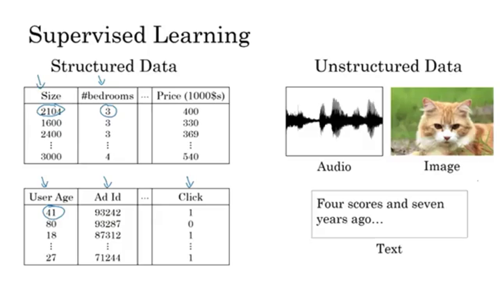 So that's structured data, meaning that each of the features,such as size of the house, the number of bedrooms,or the age of a user, has a very well defined meaning. In contrast, unstructured data refers to things like audio, raw audio, or images where you might want to recognize what's in the image or text. Here the features might be the pixel values in an image or the individual words in a piece of text.