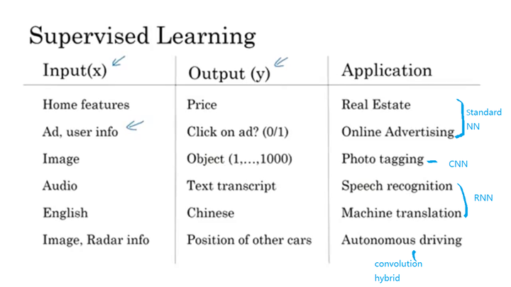 There's been a lot of hype about neural networks.And perhaps some of that type is justified,given how well they're working.But it turns out that so far,almost all the economic value created by neural networks has been through one type of machine learning,called supervised learning. Let's see what that means, and let's go over some examples. In supervised learning, you have some input x,and you want to learn a function mapping to some output y.