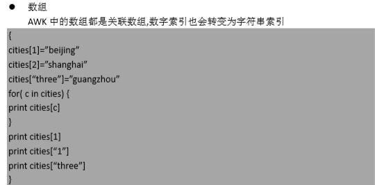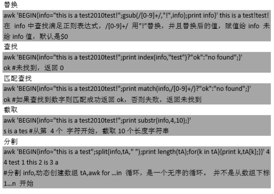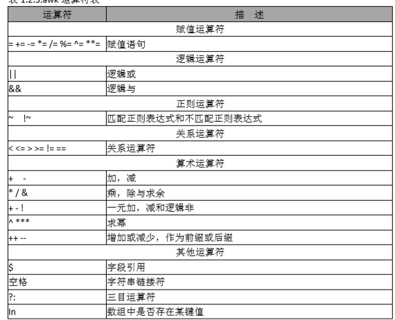 #awk赋值运算 [root@server ~]# awk 'BEGIN{a=5;a+=5;print a}' 10 #逻辑运算 [root@server ~]# awk 'BEGIN{a=5;b=2;print(a>2&&b>1,a=1||b>1)}' 1 1 #awk正则运算符 [root@server ~]# awk 'BEGIN{a="100testaaaagje";if(a~/100/){print "ok"}}' ok [root@server ~]# echo |awk 'BEGIN{a="100testaaa"}a~/100/{print "ok"}' ok #关系运算符 [root@server ~]# awk 'BEGIN{a=23;if(a>10){print "ok"}}' ok [root@server ~]# awk 'BEGIN{a=11;b=23;if(a<b){print "it is ok"}}' it is ok #算数运算符 [root@server ~]# awk 'BEGIN{a=5;print a++,++a}' 5 7 [root@server ~]# awk 'BEGIN{a="20b4";print a++,++a}' 20 22 #其它运算:三目运算 [root@server ~]# awk 'BEGIN{a="b";print a=="b"?"ok":"err"}' ok [root@server ~]# awk 'BEGIN{a="b";print a=="c"?"ok":"err"}' err