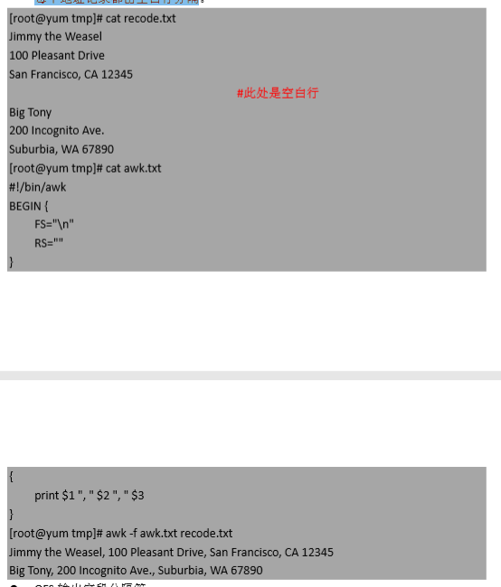 #字段分隔符FS [root@server ~]# cat /etc/passwd|awk 'BEGIN{FS=":"}{print $1}' #FS="\t" 一个或者多个Tab分隔 #FS="[[:space:]+]" 一个或者多个空格,默认的 #FS="[" ":]+" 一个或者多个空格或者:分隔 #字符数量NF(number filed) #当字段数为7时,打印当前行 [root@server ~]# cat /etc/passwd|awk 'BEGIN{FS=":"}{if(NF==7){print $0}}' #记录数量NR(numer row) #当行数为7时,打印当前行 [root@server ~]# cat /etc/passwd|awk 'BEGIN{FS=":"}{if(NR==7){print $0}}' #RS记录分隔符变量 #将 FS 设置成"\n"告诉 awk 每个字段都占据一行。通过将 RS 设置成"",还会告诉 awk 每个地址记录都由空白行分隔
