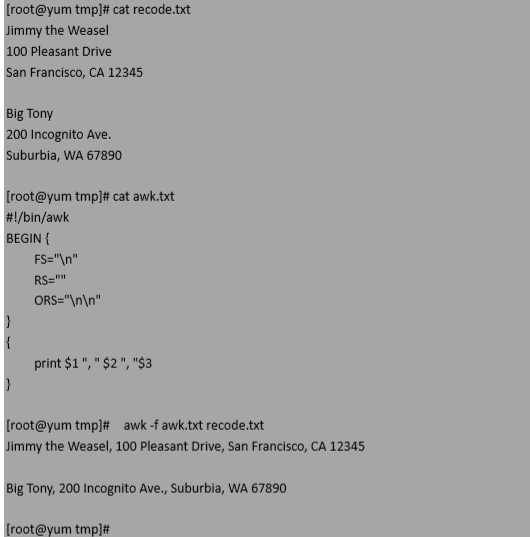 执行awk时,它依次对/etc/passwd中的每一行执行print命令。所有输出发送到stdout,所有得到与执行cat /etc/passwd完全相同。