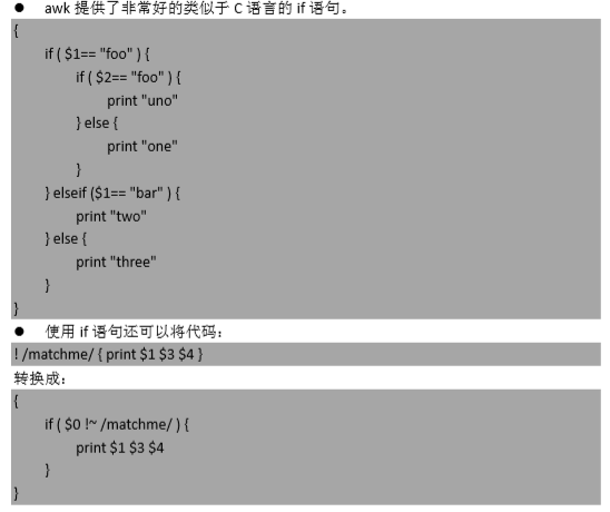 #规则表达式 #awk '/REG/{action}' file,/REG/为正则表达式,可以将$0中,满足条件的的记录送入到action进行处理 [root@server awk]# cat /etc/passwd|awk 'BEGIN{FS=":"}/^a/{print $1}' #布尔表达式 #awk '布尔表达式{action}' file 仅当对前面的布尔表达式求值为真是,awk才执行代码块 [root@server awk]# cat /etc/passwd|awk 'BEGIN{FS=":"}$1=="root"{print $0}' root:x:0:0:root:/root:/bin/bash 等同于 [root@server awk]# cat /etc/passwd|awk 'BEGIN{FS=":"}{if($1=="root"){print $0}}' root:x:0:0:root:/root:/bin/bash