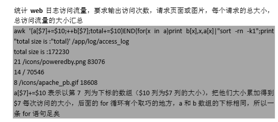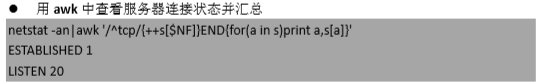 #awk数组应用 #统计用户的shell类型 [root@server awk]# cat /etc/passwd|awk 'BEGIN{FS=":"}{a[$7]+=1}END{for(i in a)print(i,a[i])}' /bin/sync 1 /bin/bash 12 /sbin/nologin 49 /sbin/halt 1 /bin/false 2 /sbin/shutdown 1