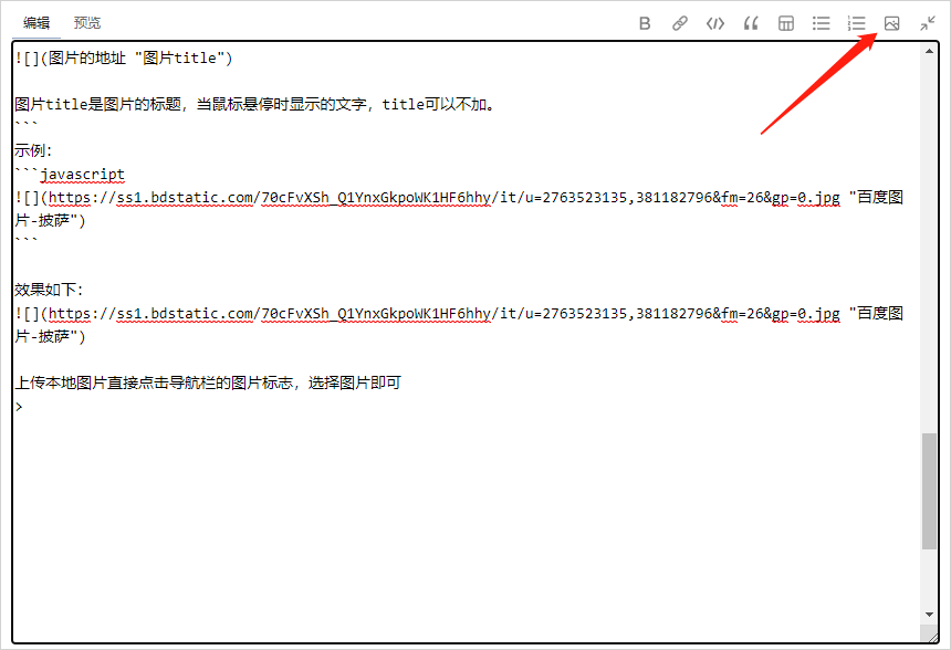 上传本地图片直接点击导航栏的图片标志,选择图片即可