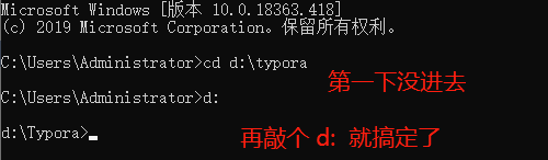 C:\> d: //如果该指定文件夹在另一个卷标,比如D盘中,需要再敲一个d: 才可以进入到D盘的这个文件夹中