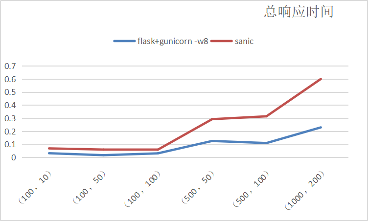 对总响应时间可以看出,sanic的总响应时间明显长于flask+gunicorn