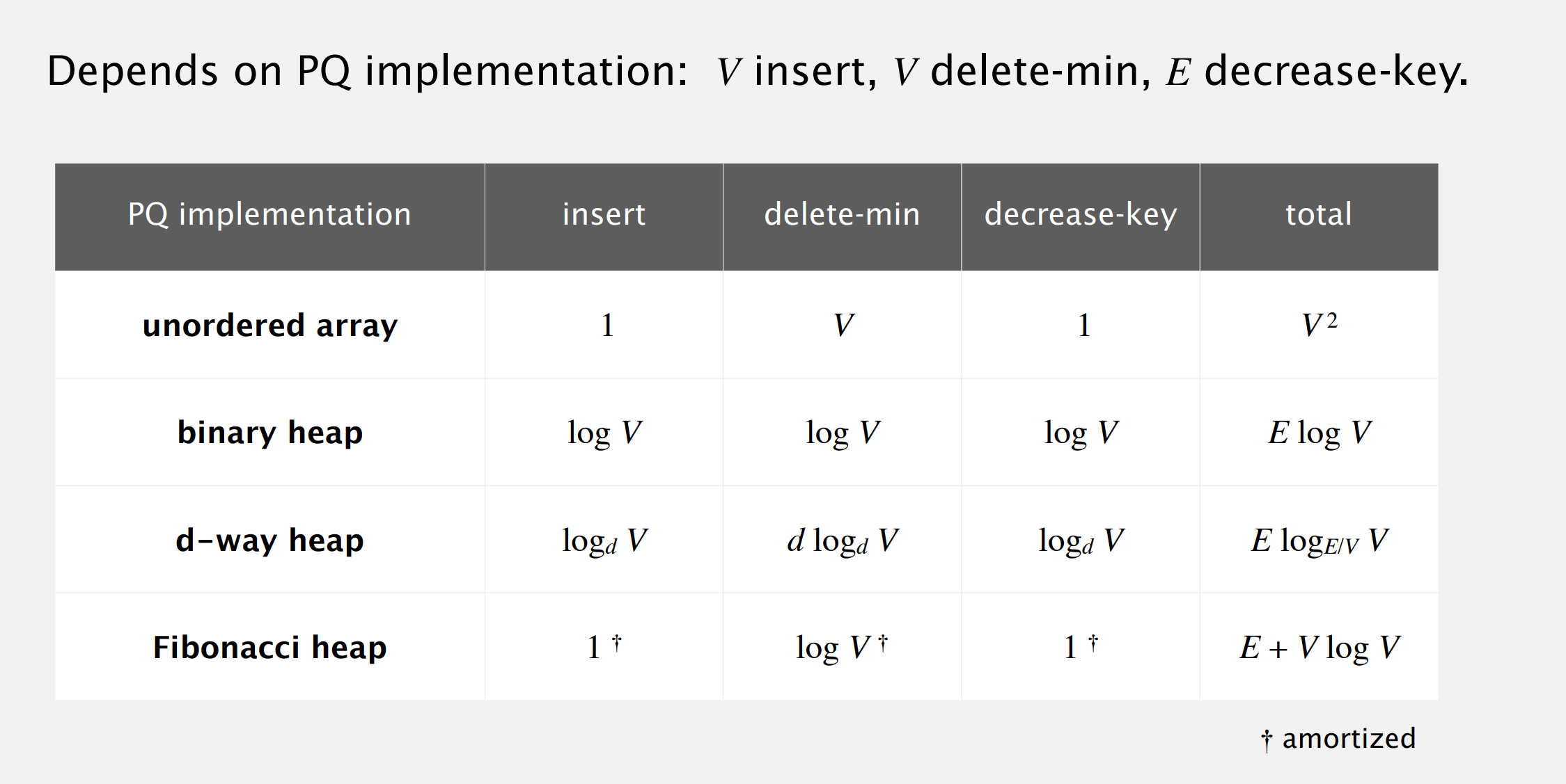 使用基于二叉堆的优先队列后,时间为\(VlogV+VlogV+ElogV\)~\(ElogV\)