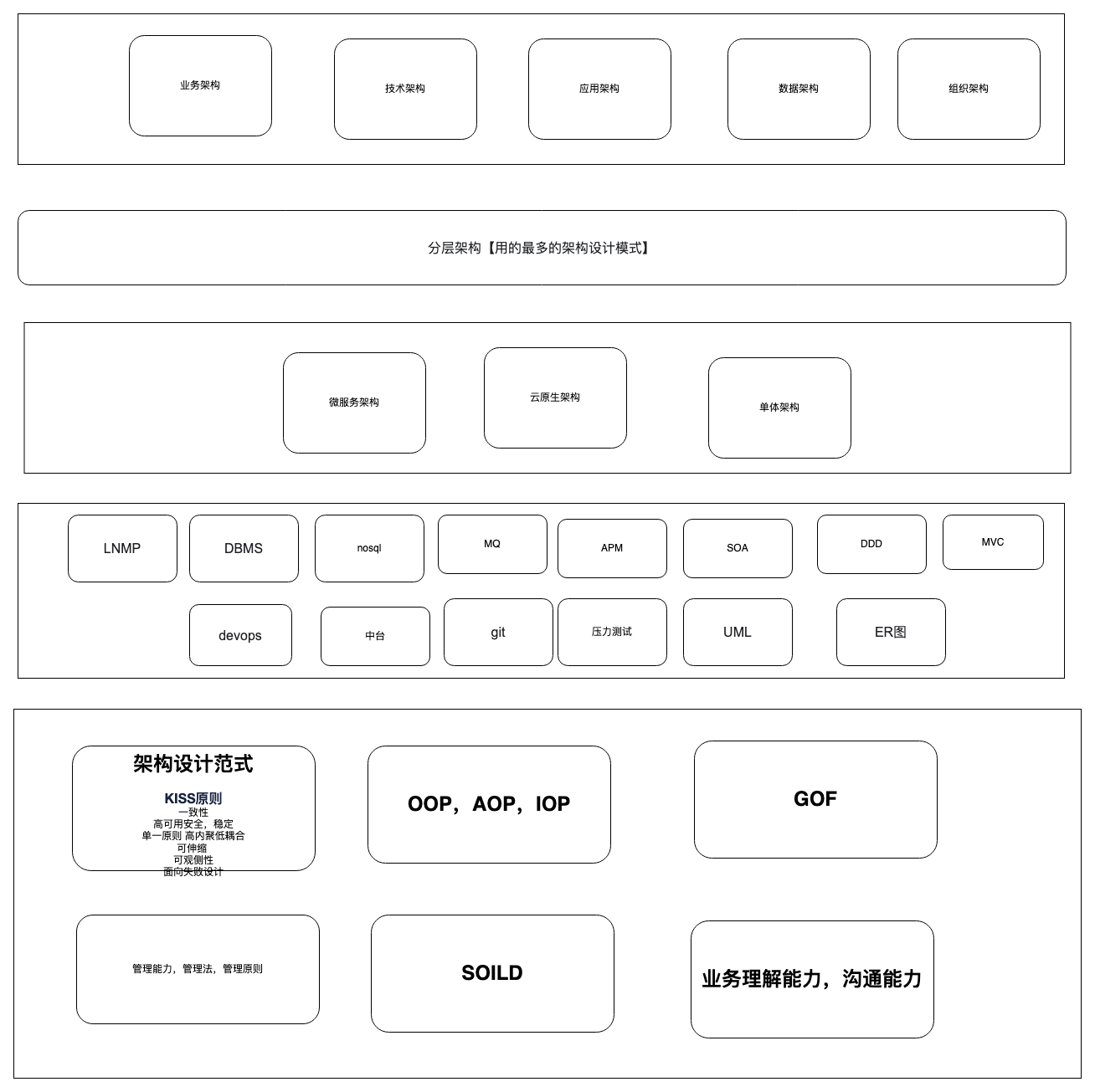 知识体系:架构类型,技术架构表现形式,常见架构模型,架构基础知识,架构设计原则和oo过程,架构图只是架构的描述形式而已