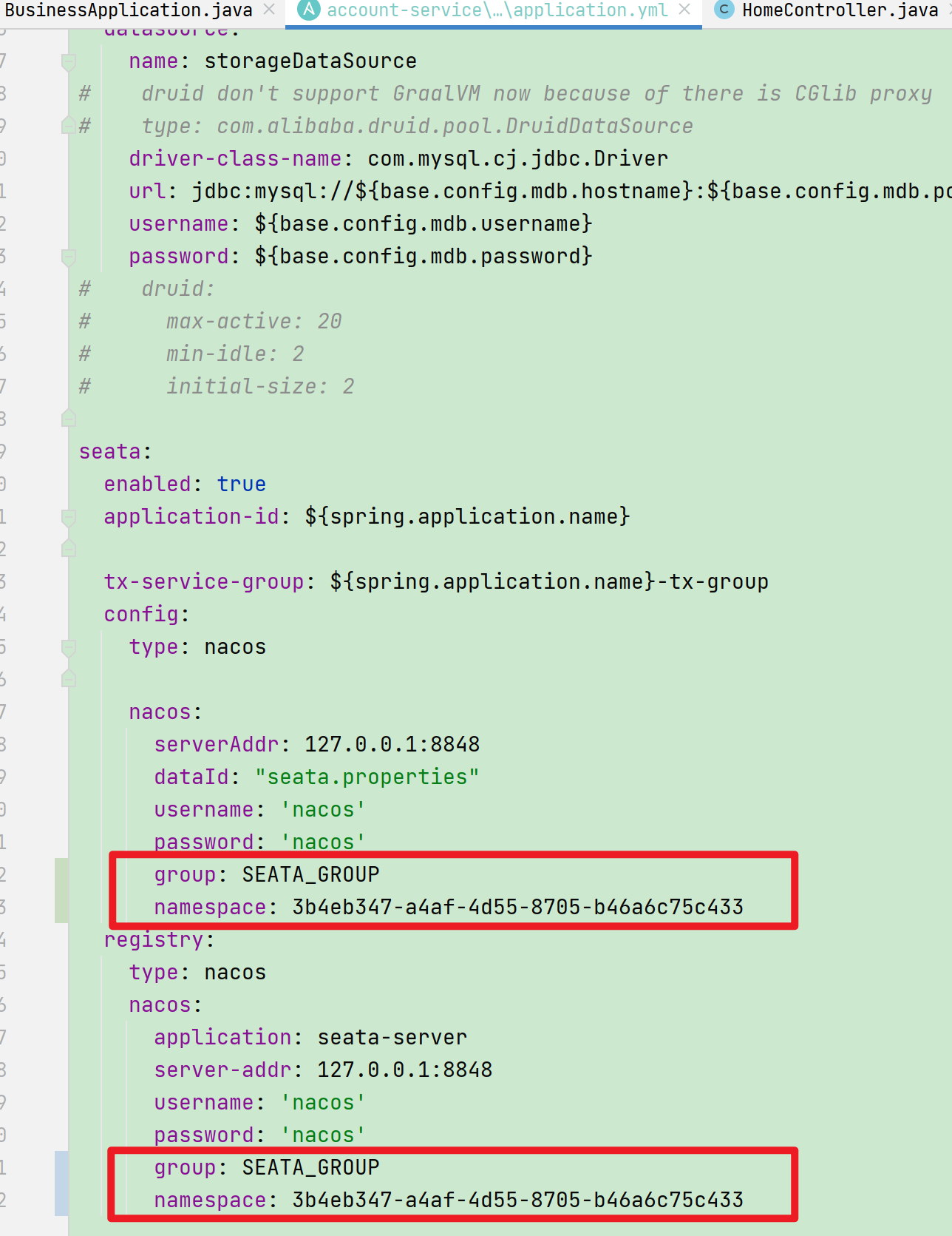 - nacos 配置的seata.properties 的namespace,group;与seata-server的application.yml中 配置namaspace,group; 与代码中xxx-service的application.yml中的namaspace, group 这3个地方均需要保持一致;