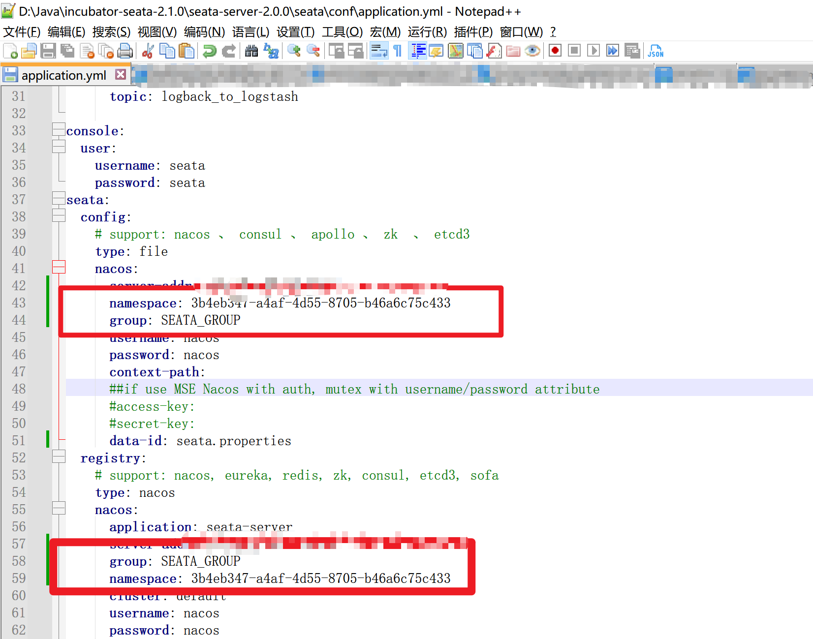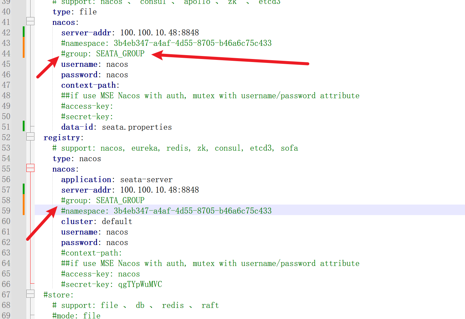 (如果你并没有在nacos使用你新建的命名空间,使用的默认的public命名空间,则只需要注释掉seata-server的application.yml中 配置namaspace,group;)