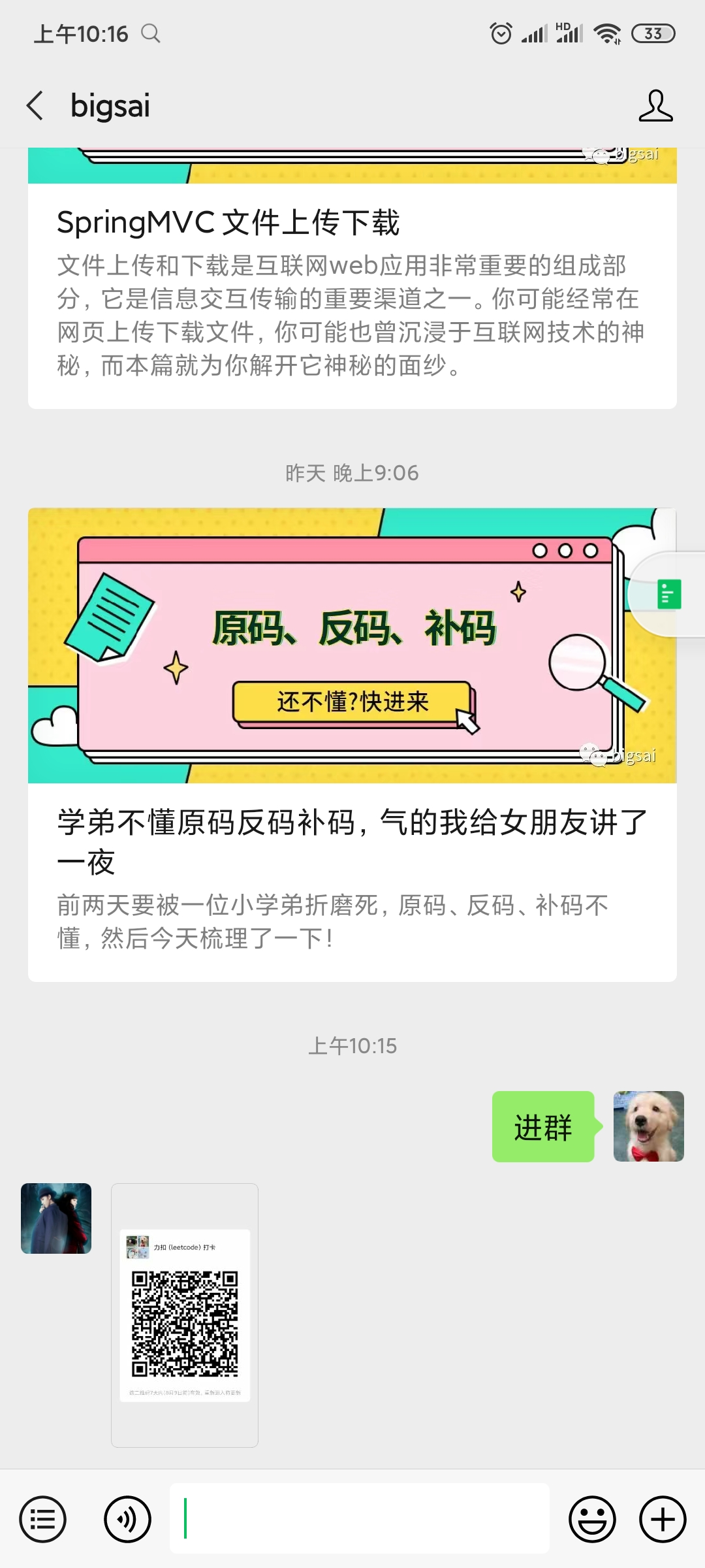 对,没错,就是从开开始一起刷力扣,因为力扣自己还没刷过,想和大家一起开始。在笔者公众号(bigsai)后台回复进群,即可通过二维码扫码进群,也可以加笔者vxq1315426911拉你进群。