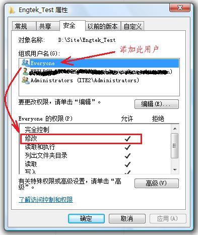 解决方法,到站点目录的属性,安全标签,添加用户(Everyone),并给修改权限: