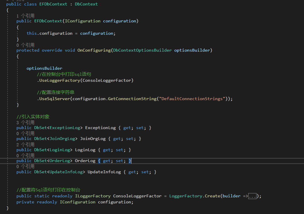 public EFDbContext(IConfiguration configuration) { this.configuration = configuration; } protected override void OnConfiguring(DbContextOptionsBuilder optionsBuilder) { optionsBuilder //在控制台中打印sql语句 .UseLoggerFactory(ConsoleLoggerFactor) //配置连接字符串 .UseSqlServer(configuration.GetConnectionString("DefaultConnectionStrings")); } //引入实体对象 public DbSet<ExceptionLog> ExceptionLog { get; set; } public DbSet<JoinOrgLog> JoinOrgLog { get; set; } public DbSet<LoginLog> LoginLog { get; set; } public DbSet<OrderLog> OrderLog { get; set; } public DbSet<UpdateInfoLog> UpdateInfoLog { get; set; } //配置将Sql语句打印在控制台 public static readonly ILoggerFactory ConsoleLoggerFactor = LoggerFactory.Create(builder => { builder.AddFilter((catergory, level) => catergory == DbLoggerCategory.Database.Command.Name && level == LogLevel.Information) .AddConsole(); }); private readonly IConfiguration configuration;