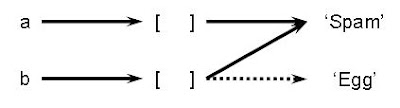 這是因為Python的變數事實上不是存放物件本身,而只是Reference,類似C語言的指標,指向物件所在之記憶體位置。當指定新值給變數時,就是改變Reference指向新的物件。