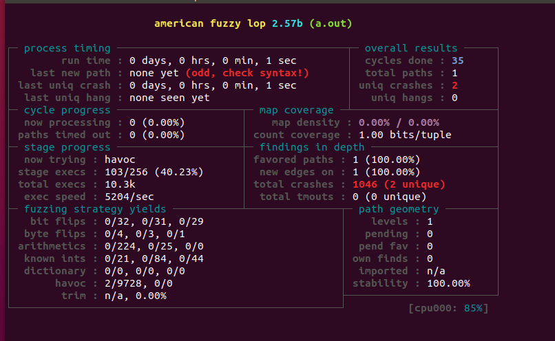 使用afl-fuzz -i fuzz_in -o fuzz_iout ./a.out