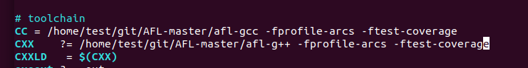 - CXX ?= /usr/local/bin/afl-g++ (修改)
