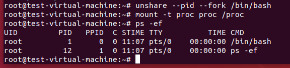 --fork:执行 unshare 的进程 fork 一个新的子进程,在子进程里执行 unshare 传入的参数。--pid:不从父进程继承 pid 的 namespace。也就是说,在子进程内执行 ps,无法看到父进程原有的进程。