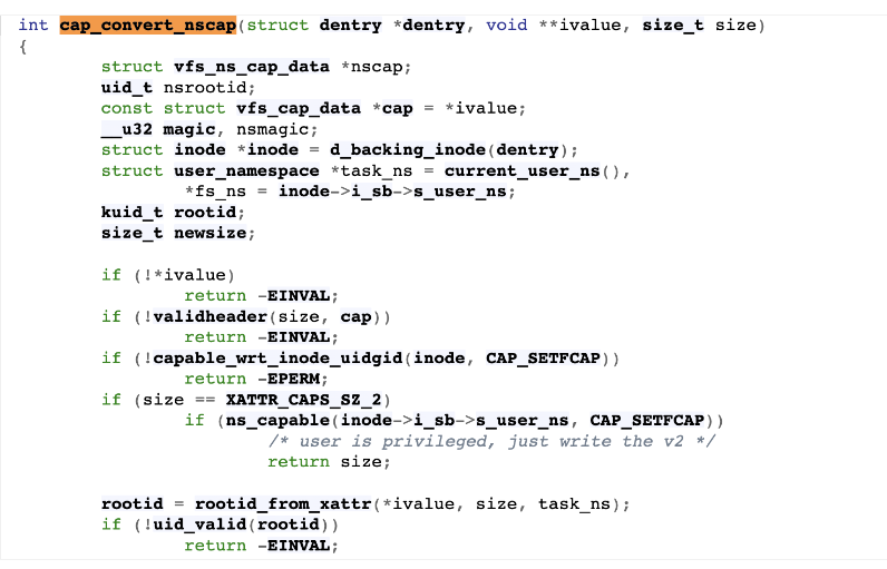 cap_convert_nscap()函数用来校验权限,包括文件所属的 namespace 与当前环境的 namespace 是否一致,以及当前用户是否具有 CAP_SETFCAP(允许为文件设置任意的 capabilities)的权限。