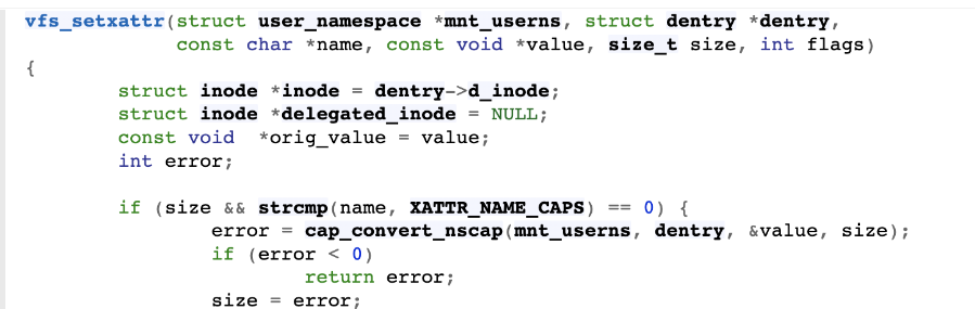 setxattr()中的cap_convert_nscap()校验函数移动到了vfs_setxattr()中。