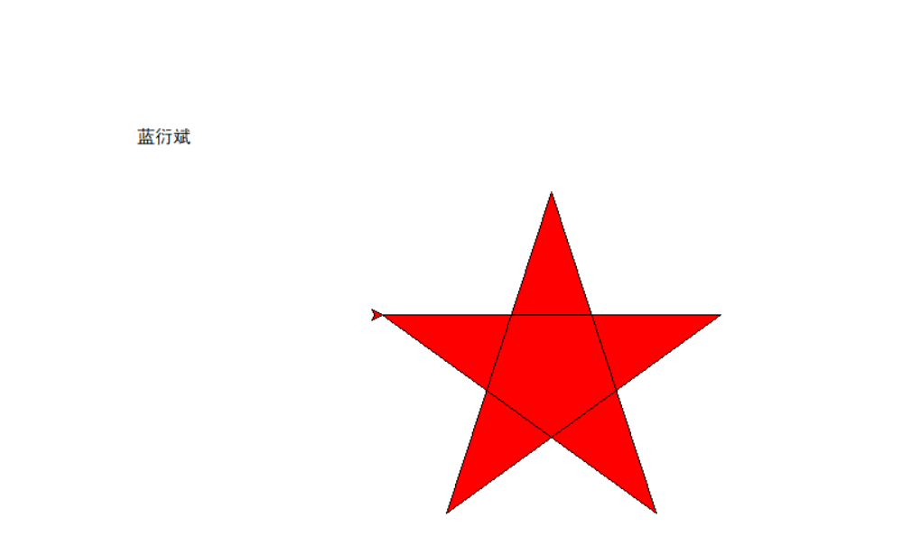 import turtle # 设置画布大小 turtle.setup(500,500,200,200) # 设置初始位置 turtle.penup() turtle.left(90) turtle.fd(-150) turtle.pendown() turtle.right(90) # 输出文字 printer = turtle.Turtle() printer.hideturtle() printer.penup() printer.back(200) printer.write(" 蓝衍斌", align="center", font=("黑体", 12, "normal")) import turtle as t t.fillcolor("red") t.begin_fill() for i in range(5): t.fd(300) t.right(144) t.end_fill() t.done()