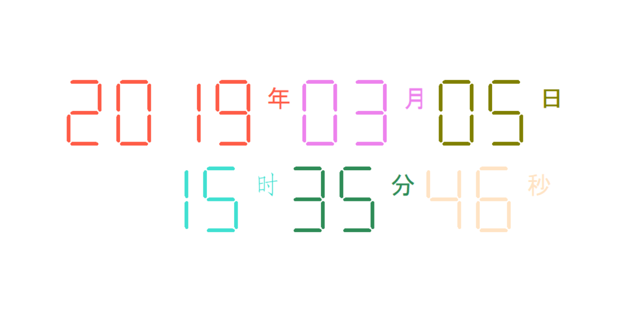 import turtle as t import time def popspace(): #单管间隔 t.penup() t.fd(5) def popline(draw): #画数码管 popspace() t.pendown() if draw else t.penup() t.fd(40) popspace() t.right(90) def popstart(d): #画数字数码管 popline(True) if d in [2,3,4,5,6,8,9] else popline(False) popline(True) if d in [0,1,3,4,5,6,7,8,9] else popline(False) popline(True) if d in [0,2,3,5,6,8,9] else popline(False) popline(True) if d in [0,2,6,8] else popline(False) t.left(90) popline(True) if d in [0,4,5,6,8,9] else popline(False) popline(True) if d in [0,2,3,5,6,7,8,9] else popline(False) popline(True) if d in [0,1,2,3,4,7,8,9] else popline(False) t.left(180) t.penup() t.fd(30) def popdate(date): t.pencolor((1,0.36,0.28)) t.speed(9) for i in date: if i == '-': t.write('年',font=("Arial", 30, "normal")) t.pencolor((0.93,0.51,0.93)) t.fd(60) elif i == '=': t.write('月',font=("Arial", 30, "normal")) t.pencolor((0.5,0.5,0)) t.fd(60) elif i == '+': t.write('日',font=("Arial", 30, "normal")) t.pencolor((0.25,0.88,0.82)) t.fd(40) #换行输出 t.seth(-90) t.fd(100) t.seth(180) t.fd(700) t.seth(-90) t.fd(40) t.seth(0) t.fd(40) elif i == '*': t.write('时',font=("Arial", 30, "normal")) t.pencolor((0.18,0.55,0.34)) t.fd(60) elif i == '/': t.write('分',font=("Arial", 30, "normal")) t.pencolor((1,0.89,0.77)) t.fd(60) elif i == '!': t.write('秒',font=("Arial", 30, "normal")) else: popstart(eval(i)) def main(): t.setup(1000, 800, None,None) t.penup() t.fd(-350) t.pensize(6) popdate(time.strftime('%Y-%m=%d+%H*%M/%S!',time.localtime())) t.hideturtle() main()