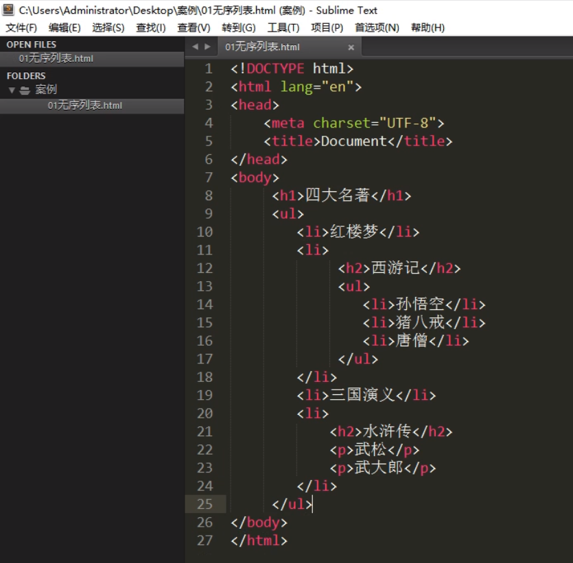 主要作用:可以在网页中搭建一个没有顺序的列表