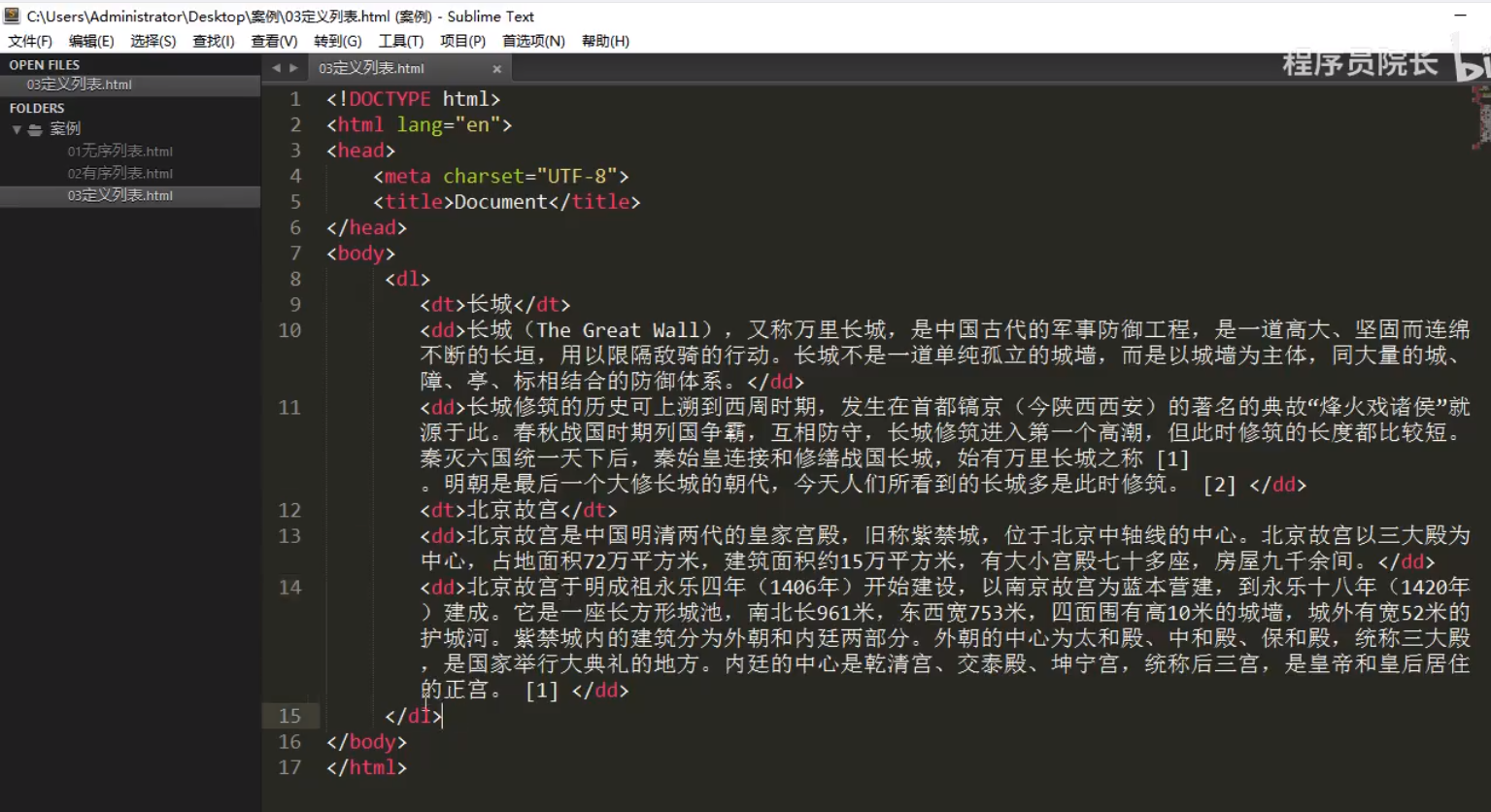在使用定义列表时需要结合3个标签一起使用,分别是:<dl> <dt> <dd>