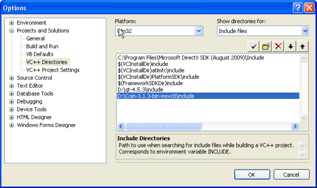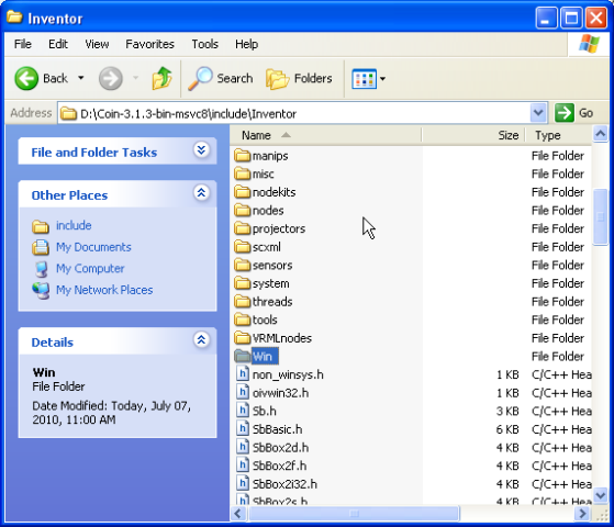 打开$(COINDIR)文件夹看看,$(COINDIR)\bin文件夹中增加了sowin1.dll、sowin1d.dll、sowin1d.pdb,$(COINDIR)\lib文件夹中增加了sowin1.lib和sowin1d.lib,$(COINDIR)\include\Inventor中增加了Win文件夹,其中含有一大堆与SoWin有关的头文件。